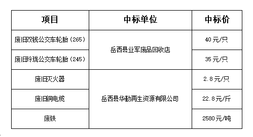 安徽省岳达客运服务有限公司于2025年10月14日至10月17日,就“废旧耗材竞价出售”项目进行了公开竞价,在满足相关要求的前提下,经评审小组评审确定中标单位,现将竞价结果公示如下: